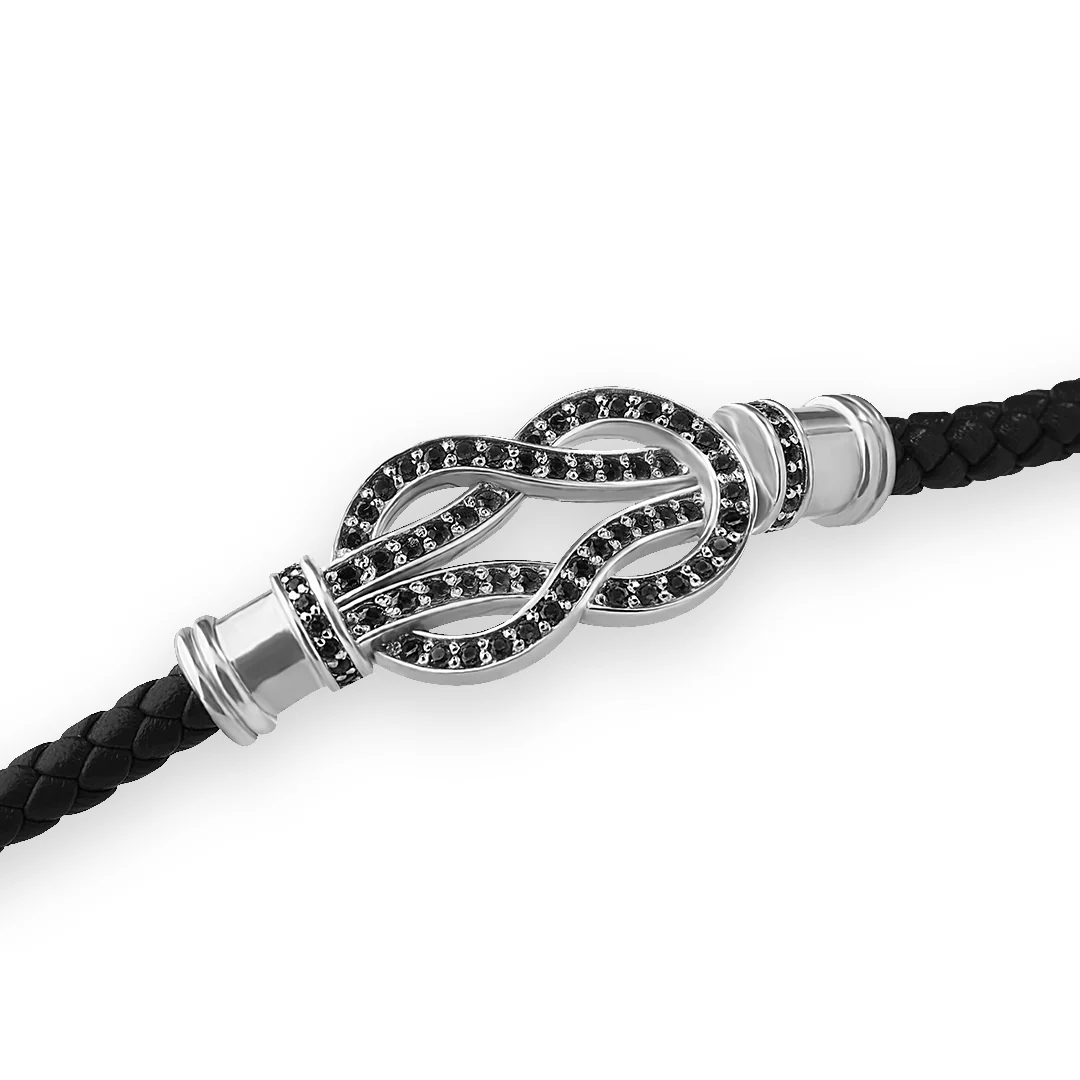 This infinity leather bracelet is the perfect way to show the world your everlasting style. Crafted from genuine leather and solid gold infinity symbol decorated with precious stones. This timeless design is perfect for any occasion, from casual outings to formal events. You can wear it alone or layer it with other bracelets for a unique look. Show off your unique style with this infinity leather bracelet.