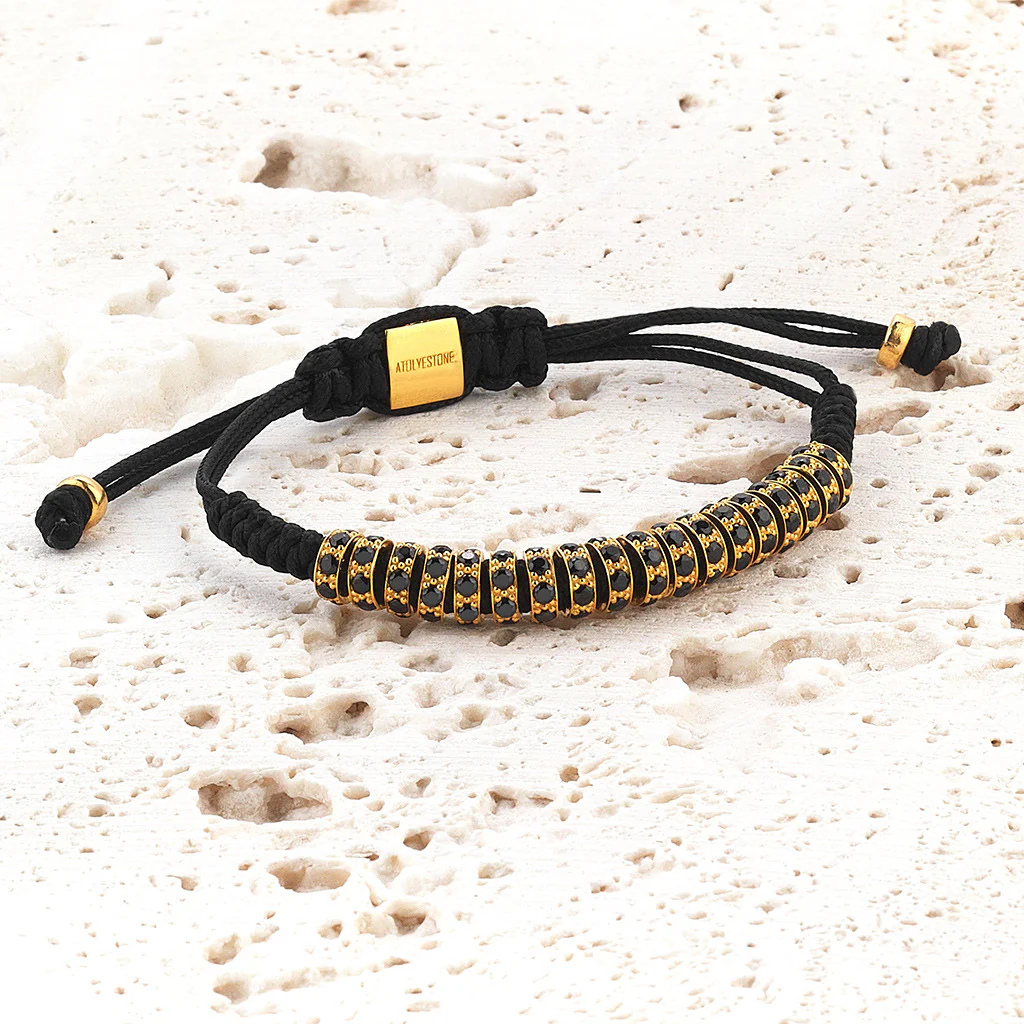 Women's Round Macrame Stoppers is one of the most minimalist jewelry of Atolyestone which is an excellent hand-made bracelet with an elegant rope knotted beautifully and adorned with gold plated solid silver round stoppers which are also paved with CZ diamonds.